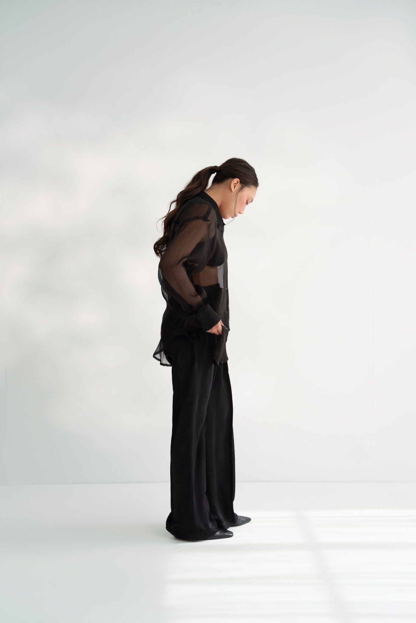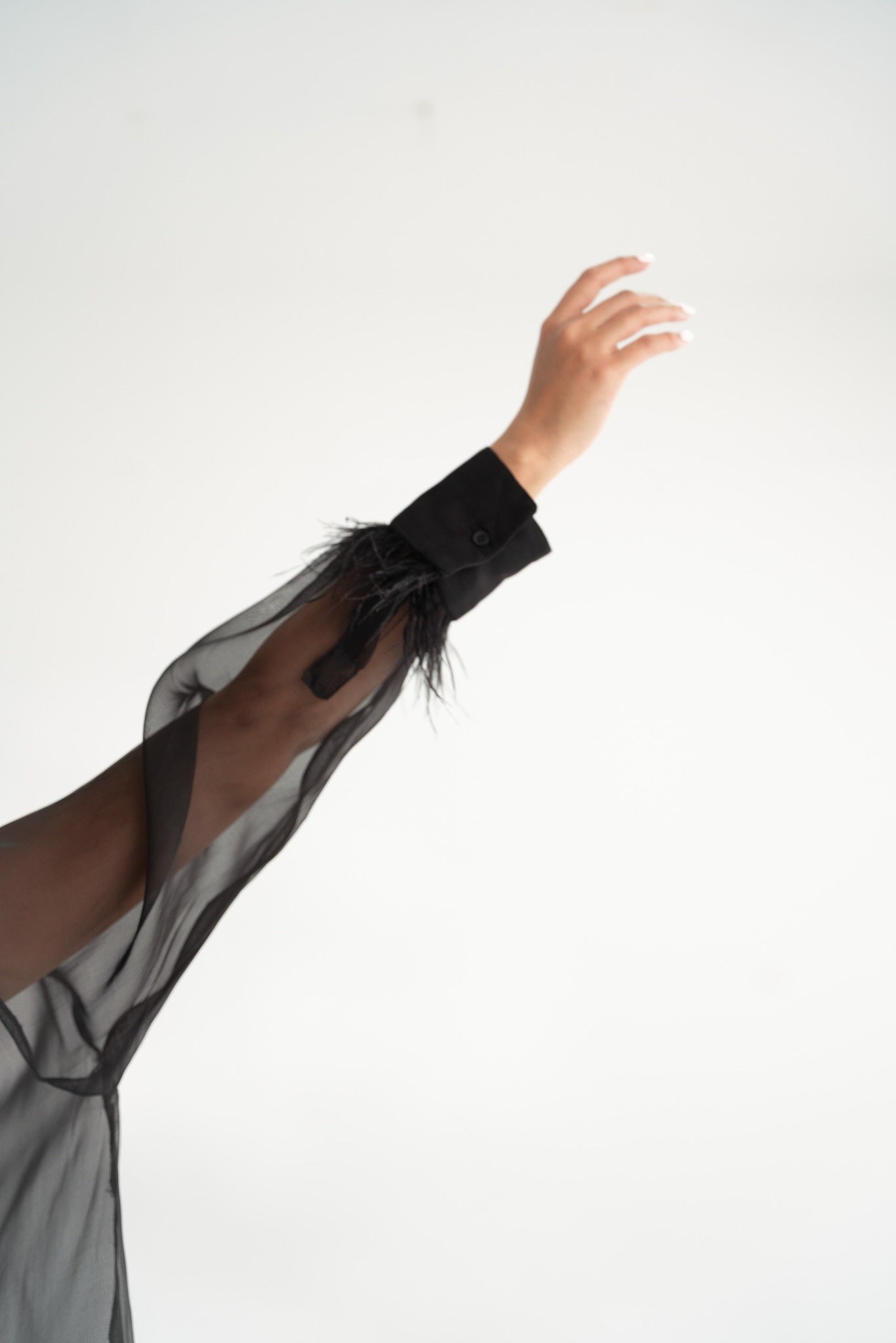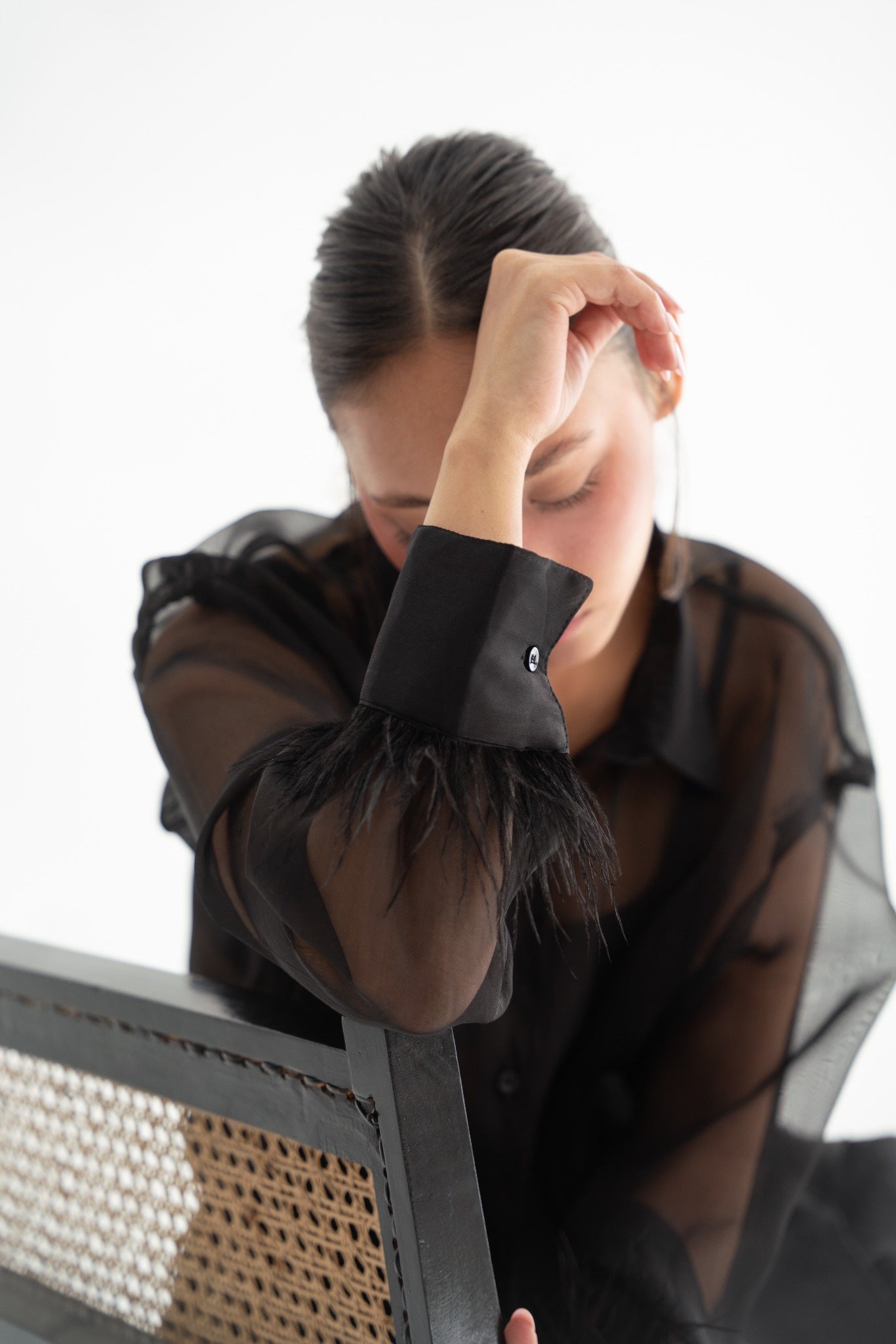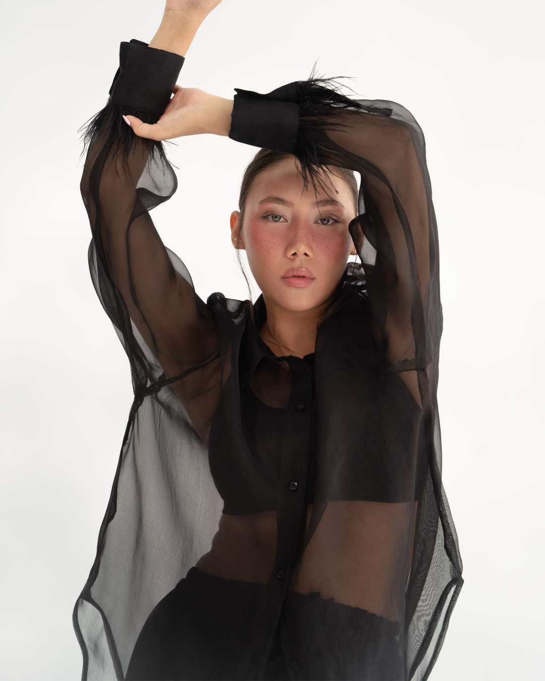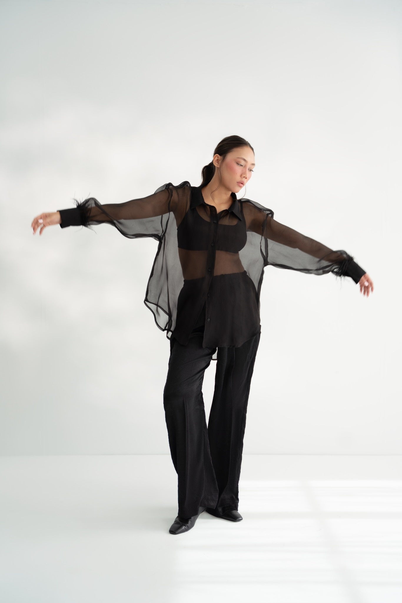 The Feather Set in midnight black is designed for evenings that call for something effortless yet considered. The sheer organza shirt is cut in a relaxed silhouette, finished with feather-trimmed cuffs that move softly with the body. Paired with a straight-leg trouser in a silk-blend, the set balances lightness with depth.